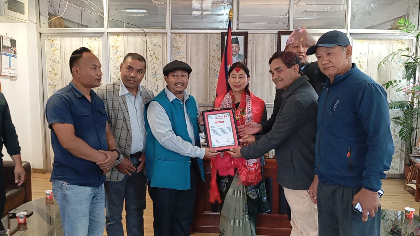 काैलागा ६, ख्वप । ख्वप जिल्ला प्रशासनया ज्याकूया साइनबोर्डय् रञ्जना लिपिं च्वयेत ध्यानाकर्षण याःगु दु । नेवाः देय् दबू ख्वप जिल्ला समिति व ख्वप नगर समितिया ग्वसालय् ख्वप जिल्ला प्रशासनया प्रमुख रोशनी कुमारी श्रेष्ठयात वय्कःया हे ज्याकुथी नापलानाः थथे ध्यानाकर्षण याःगु खः । वहे इलय् नवनियुक्त प्रमुख श्रेष्ठयात सगं नापं धौ सगं बियाः भिंतुना पौ लःल्हानाः भिंतुना देछाःगु खः ।
