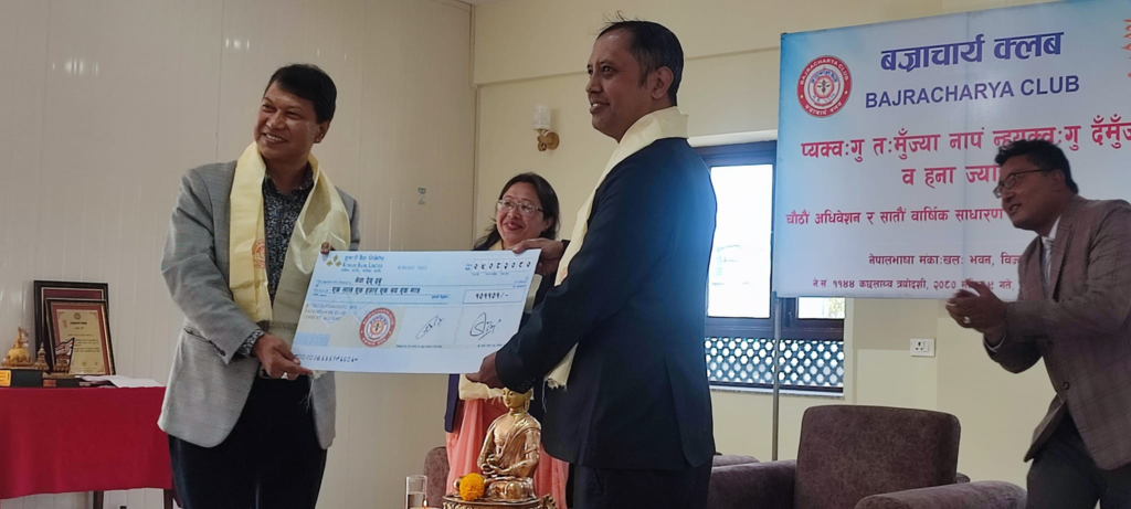 ज्याझ्वलय् बज्राचार्य क्लबया नाय: सर्जु बज्राचार्यं नेवा: छेँ दयेकेत १,०१,१०१ तकाया चेक नेवा: देय् दबूया नाय: पवित्र बज्राचार्ययात ल:ल्हात । क्लबं सामूहिक पञ्चदान ज्याझ्व:पाखें मुंगु दां ल:ल्हाःगु ख: ।